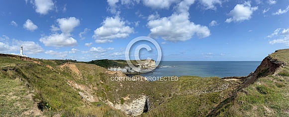 - Description: Panoramic view of the lighthouse and coastline at Flamborough Head in North Yorkshire on the northeast coast of England