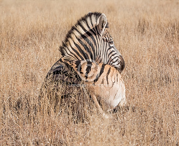 - Description: A Burchell's Zebra lying down in Southern African savanna