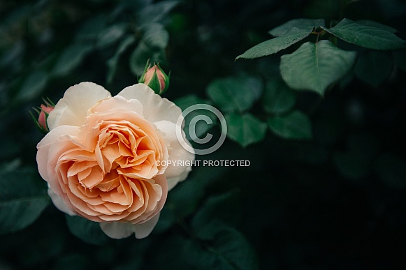 - Description: Lone delicate peach coloured flower on a dark green background.