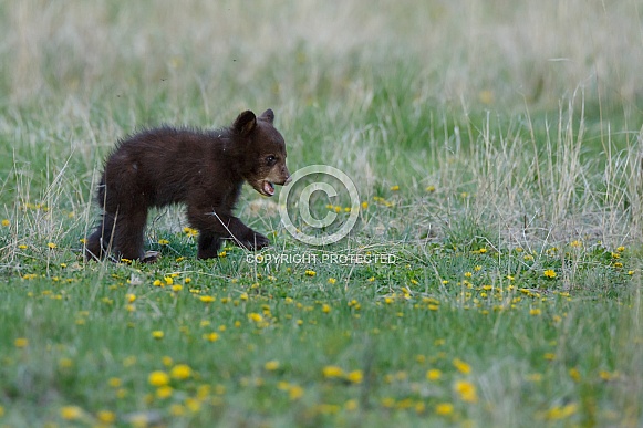 - Description: Black bear cub walking through a field with yellow flowers NOTE FROM WRP: Image not pin sharp close up but approved for the overall effect/atmosphere and composition