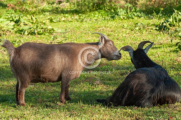 - Description: A nanny, or doe, goat gives a whisker kiss to her wether goat buddy.