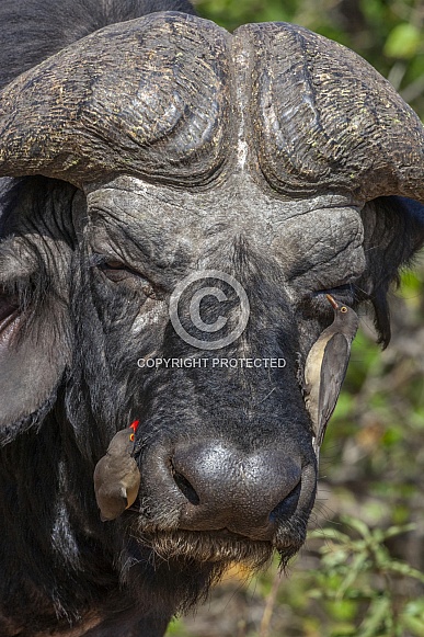 - Description: Two red-billed oxpeckers (Buphagus erythrorhynchus) feeding on a Buffalo (Syncerus caffer) in the Xakanaxa region of the Okavango Delta in Botswana, Africa.