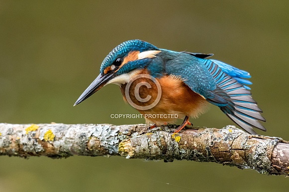 - Description: Juvenile Kingfisher stretching her wing out on her perch after a short fishing session.