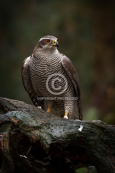 - Description: A beautiful northern goshawk eating his prey on a stump.