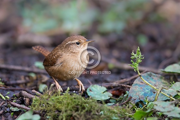 - Description: Detailed close up of a wild UK wren (Troglodytes troglodytes) standing alert in natural setting.