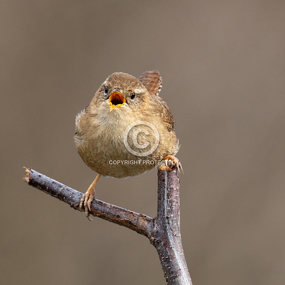 - Description: A Wren singing away on a branch. The Wren is on of the UK's smallest bird despite their size they have a loud song.